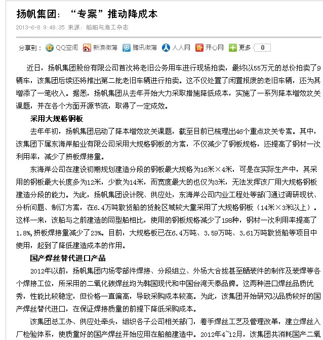 船舶與海工:揚帆集團(tuán):“專案”推動降成本